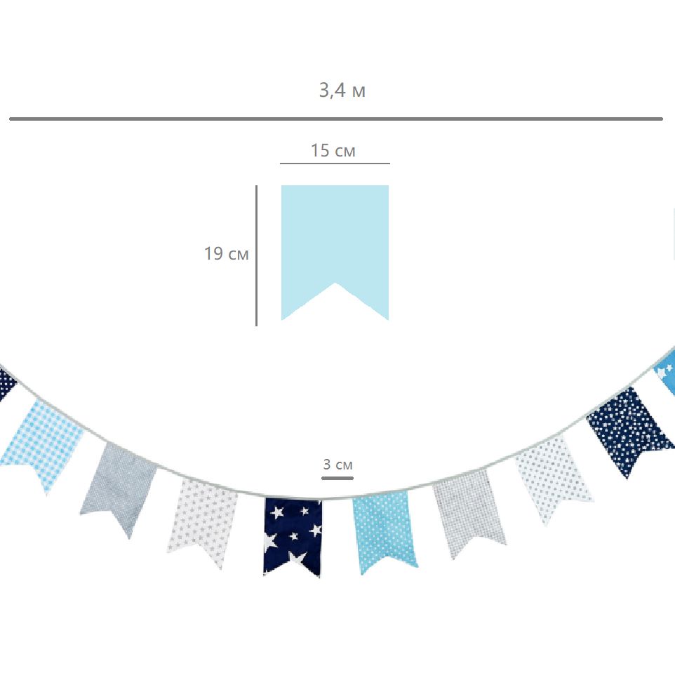 Гирлянда состоит из 12 флажков, общая длина составляет 3,4 м, расстояние между флажками 3 см, длина матерчатых флажков 2,1 м, длина лямок с обеих сторон по 50 см