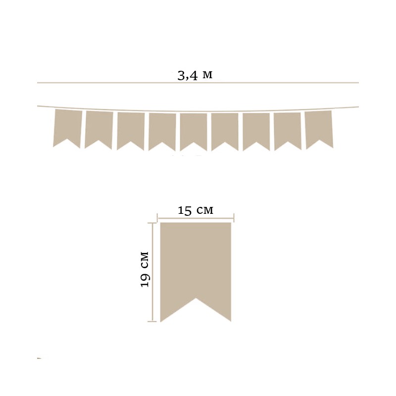Гирлянда состоит из 12 флажков, общая длина составляет 3,4 м, расстояние между флажками 3 см, длина матерчатых флажков 2,1 м, длина лямок с обеих сторон по 50 см