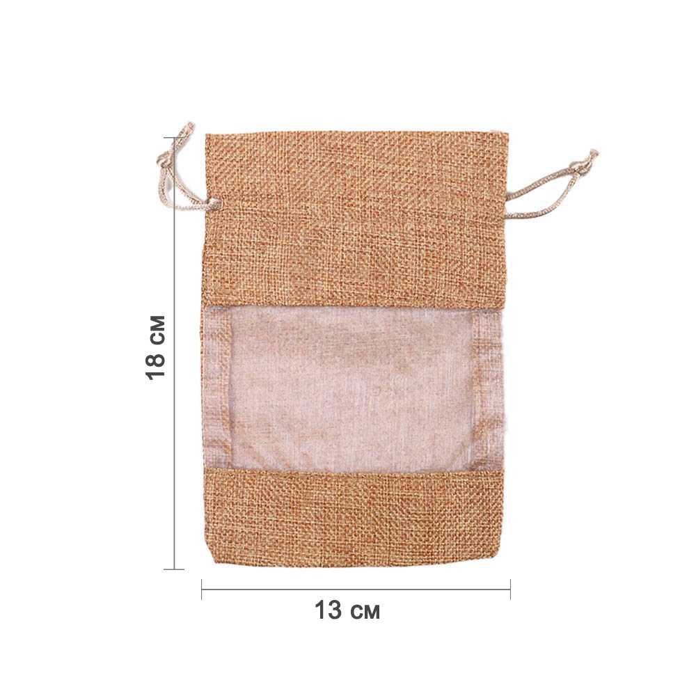 Декоративный мешочек с оригинальным дизайном: верх и дно выполнены из плотной мешковины, а центральная часть — из прозрачной органзы, благодаря чему содержимое хорошо видно со всех сторон. Такое сочетание материалов придаёт упаковке естественный, но при этом лёгкий и изящный вид.