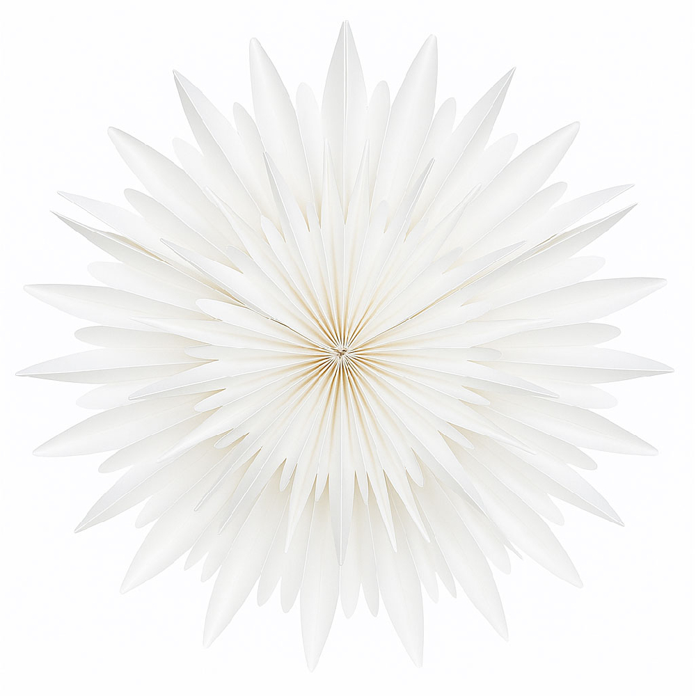 Элегантная объёмная снежинка из плотной бумаги станет стильным украшением зимнего интерьера. Нежный белый цвет придаёт оформлению лёгкость и ощущение снежной свежести, а ажурный узор делает декор утончённым и нарядным.