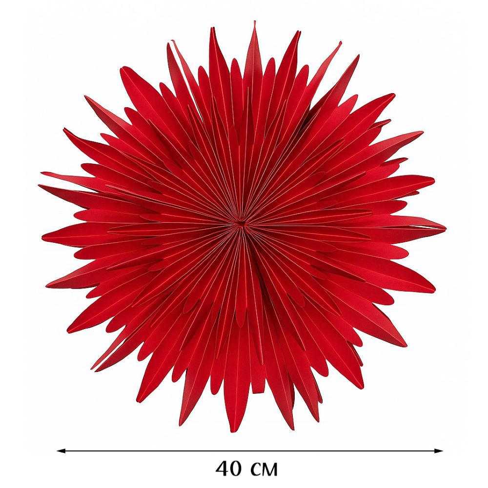 Яркая объемная снежинка из плотной бумаги станет эффектным украшением новогоднего интерьера. Насыщенный красный цвет придаёт праздничное настроение, а изящный узор делает декор лёгким и воздушным.